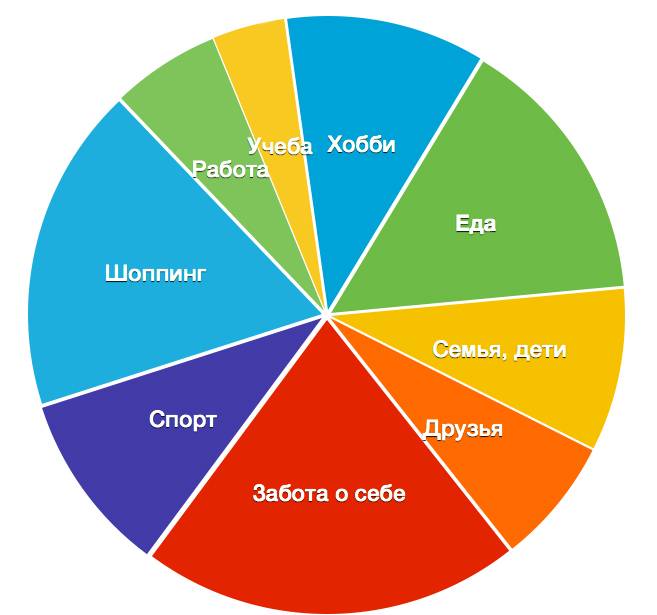 Да, например, пишешь, что сон доставляет мне удовольствие, попить кофе с другом – тоже удовольствие, просто посидеть поговорить с другом – тоже, пойти на пробежку. Это перечень всего, что доставляет тебе радость. Потом делишь на категории, как-то обобщая. Понятно, что делить круг на 33 или на 50 частей – это как-то накладно, поэтому надо обобщить и отделить место в круге для категорий.